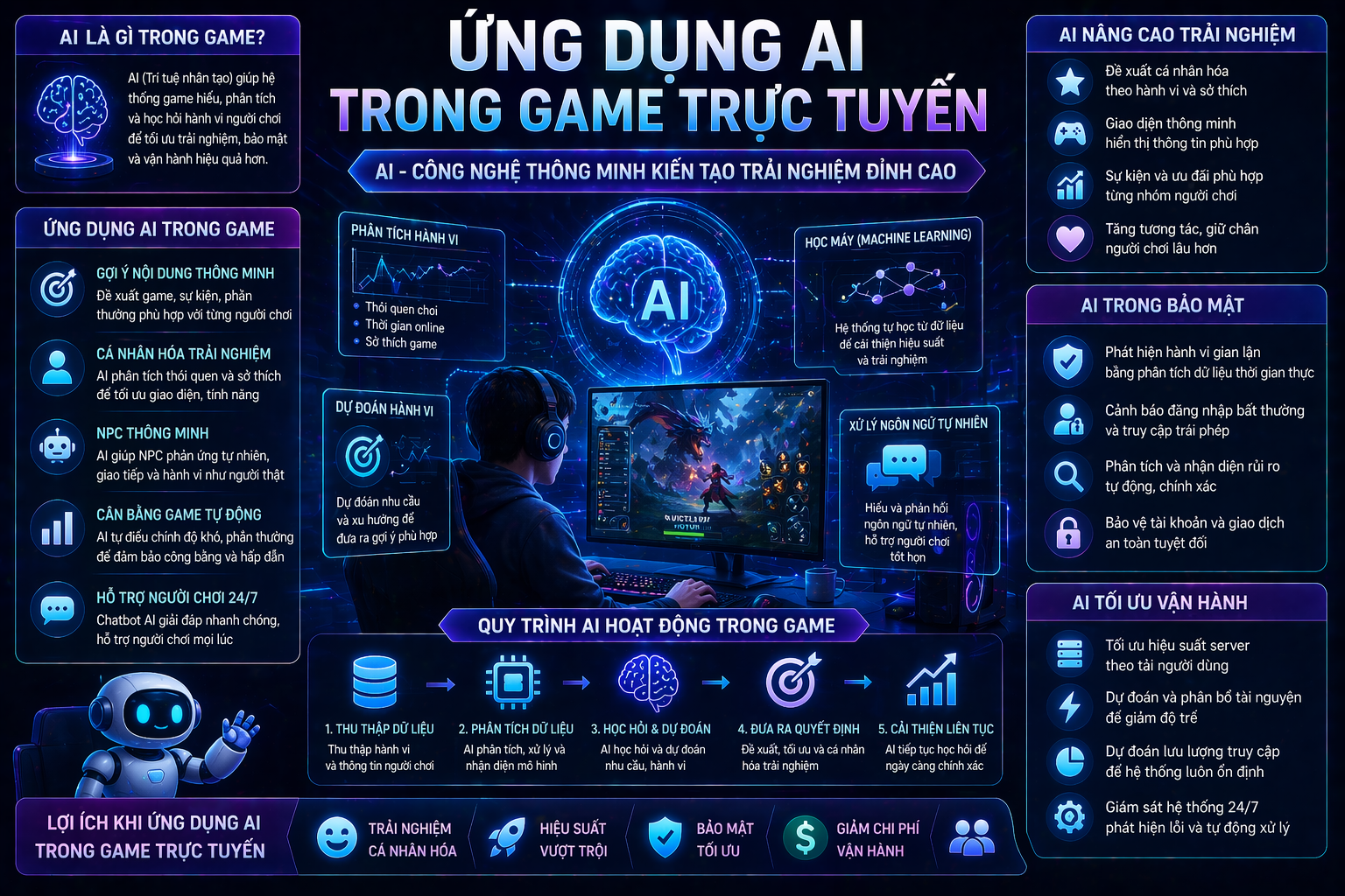 AI đang thay đổi hoàn toàn cách vận hành và trải nghiệm game online. Từ cá nhân hóa đến bảo mật, AI giúp hệ thống trở nên thông minh, nhanh và ổn định hơn.